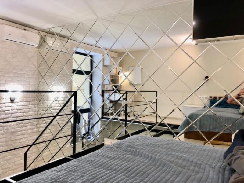 • Зеркальное панно в салоне, Москва, серебряная глянцевая плитка квадратной формы